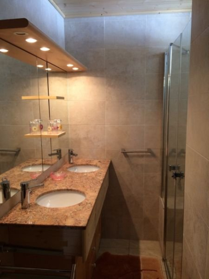 Salle de bain avec 2 vasques, douche à l'italienne, sèche-serviettes, toilettes séparées.