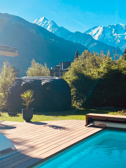 Le chalet Soleil Blanc situé au cœur des Alpes françaises à St Gervais Mont Blanc, surplombe le massif du Mont Blanc.