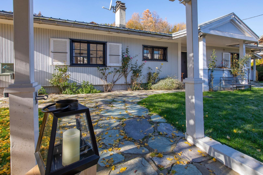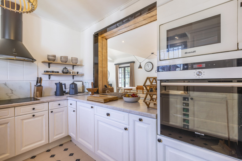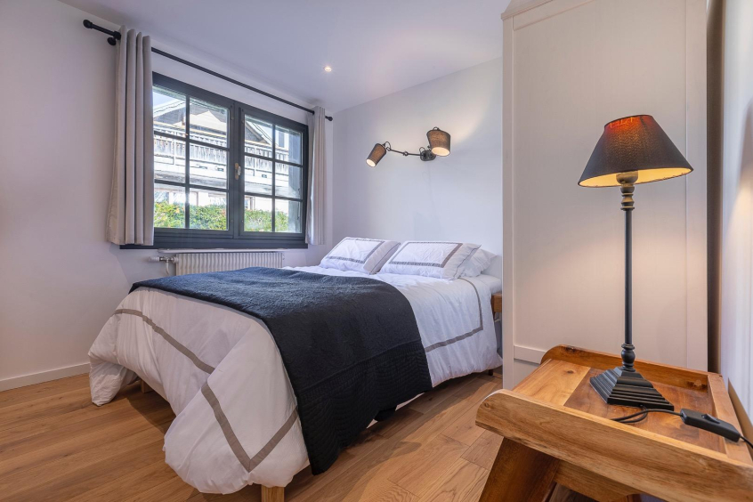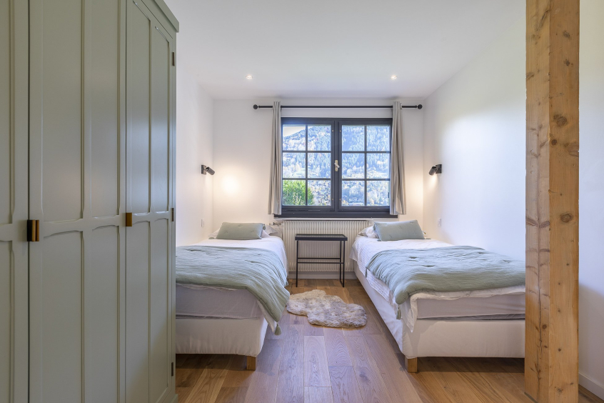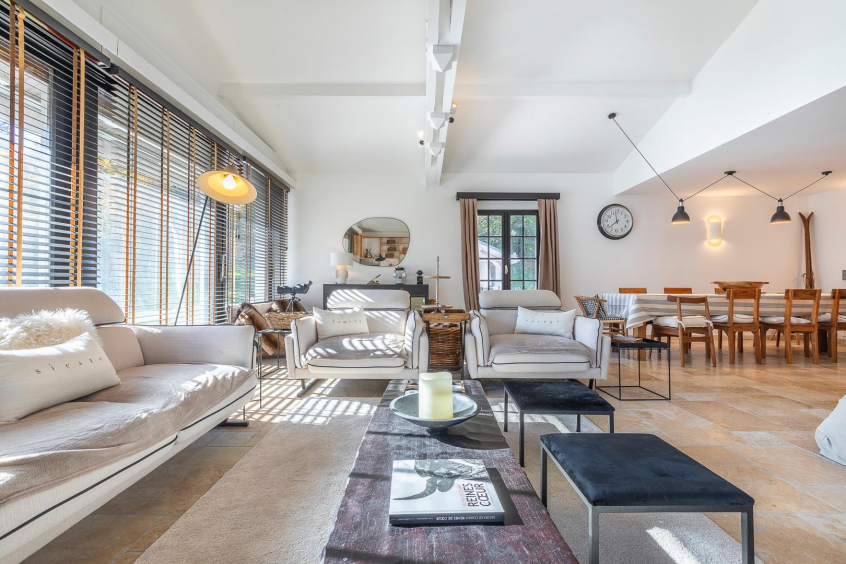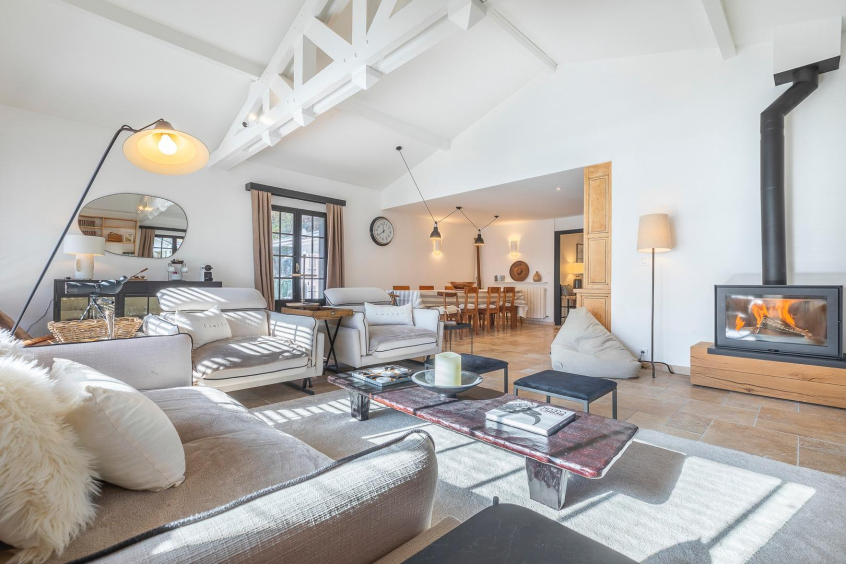 Ce chalet de plain-pied a été soigneusement restauré en utilisant des matériaux naturels, des poutres apparentes créant une élégance et une atmosphère chaleureuse avec une décoration épurée et des couleurs neutres.