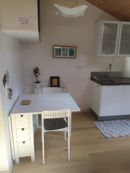 charmant studio situé aux Bossons dans un chalet individuel localisé dans un secteur calme avec vue sur le potager. Entrée indépendante au rez de chaussée qui ouvre sur un confortable sas d'entrée. Un escalier monte à la pièce principale équipée d'un canapé lit (140 cm) très confortable, d'une cuisine bien équipée (frigo, plaque induction 2 feux, bouilloire, cafetière, grille pain). La salle de bain dispose d'un lavabo, d'une douche et d'un WC. Le studio est très lumineux, bien agencé, et la décoration est chaleureuse.