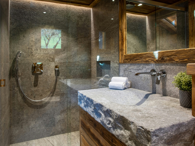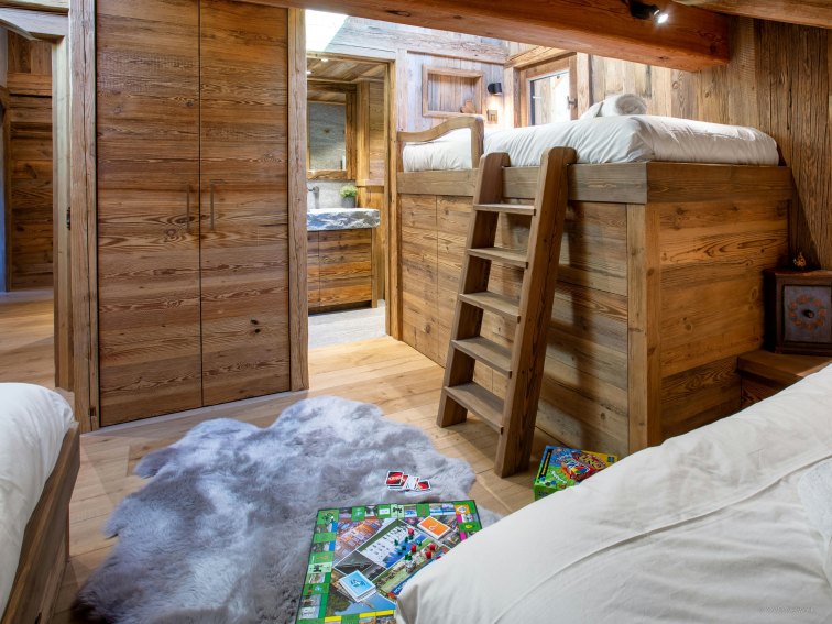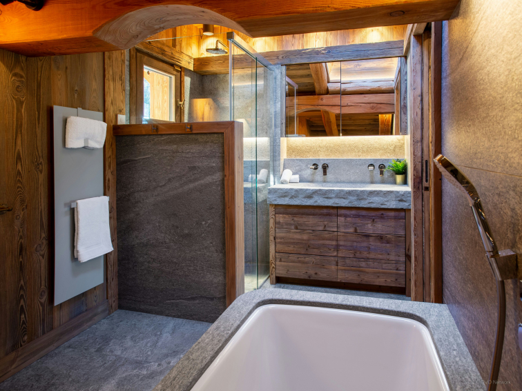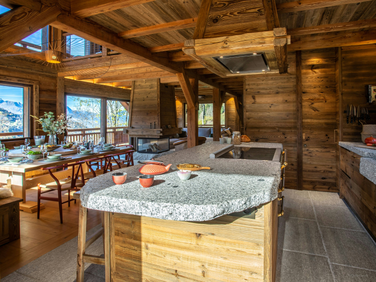 La grande pièce de vie à l’étage central ouvre sur une magnifique terrasse panoramique meublée, où le regard se perd par-dessus la vallée jusqu’au Mont Blanc. La cuisine moderne, quant à elle, comprend une grande cuisinière, deux frigos et deux lave-vaisselle, pour que cuisiner soit toujours un plaisir, même pour les grands groupes. Il y a assez d’espace pour manger tous ensemble à la grande table à manger, ou alors sur la terrasse pour profiter du bon air alpin.