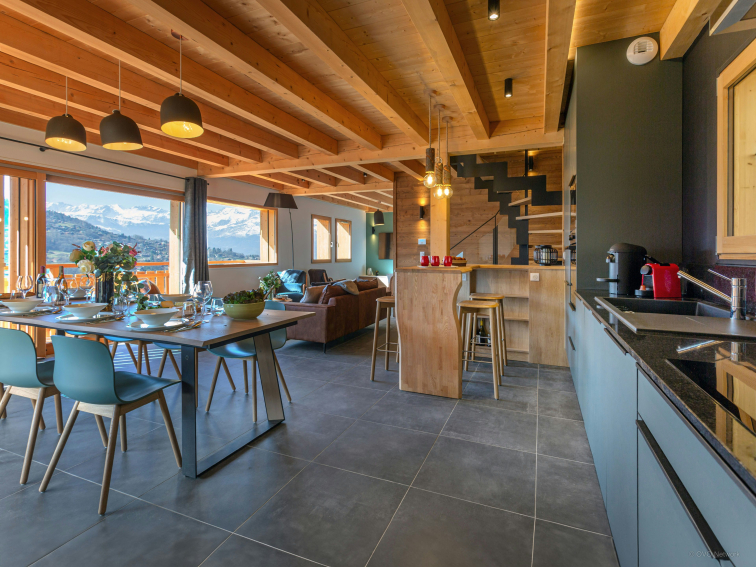 Au cœur du chalet rayonne une pièce de vie ouverte et spacieuse, qui inclut une cuisine, une table à manger, et un salon équipé de canapés confortables et d’une télévision. Sur le balcon adjacent, se trouvent une deuxième table à manger et un jacuzzi.