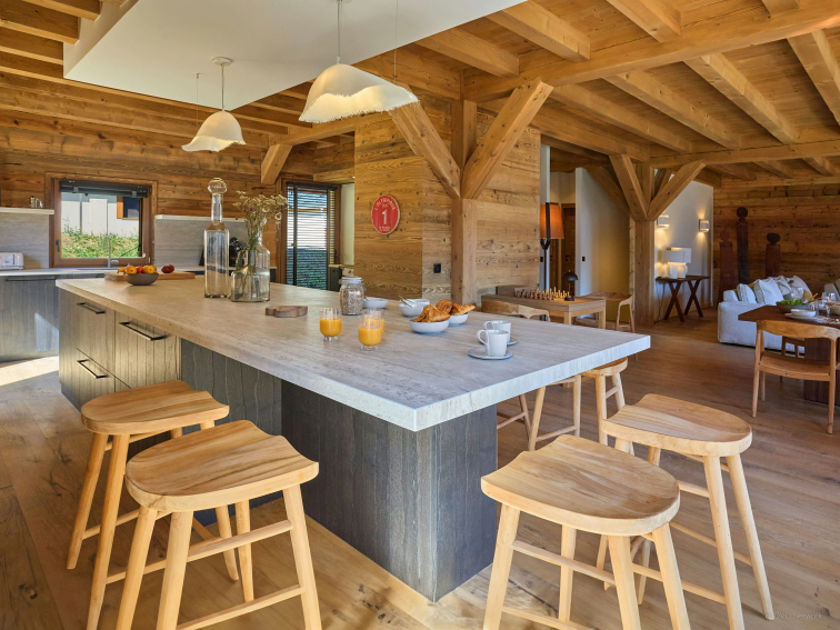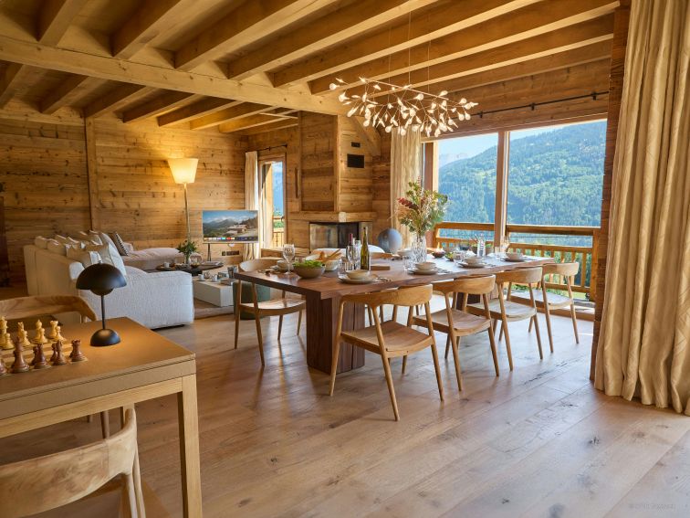 La pièce de vie, spacieuse et lumineuse, est aménagée au rez-de-chaussée. Elle comporte un large canapé modulaire placé face à une cheminée, une table d’échecs, et une table à manger qui peut accueillir tout votre groupe. Vous aurez plaisir à préparer vos repas dans la cuisine ouverte, qui compte un four, une plaque à induction, un lave-vaisselle, un réfrigérateur-congélateur, un four à micro-ondes, ainsi qu’un comptoir central avec tabourets. Des portes-fenêtres mènent à une terrasse couverte, où vous pourrez profiter du barbecue et du majestueux panorama alpin.