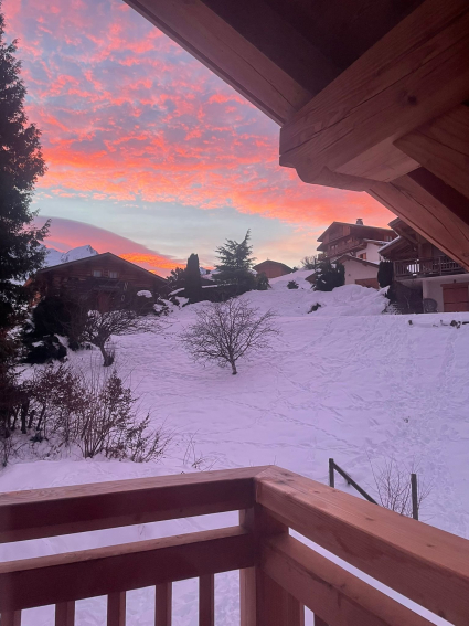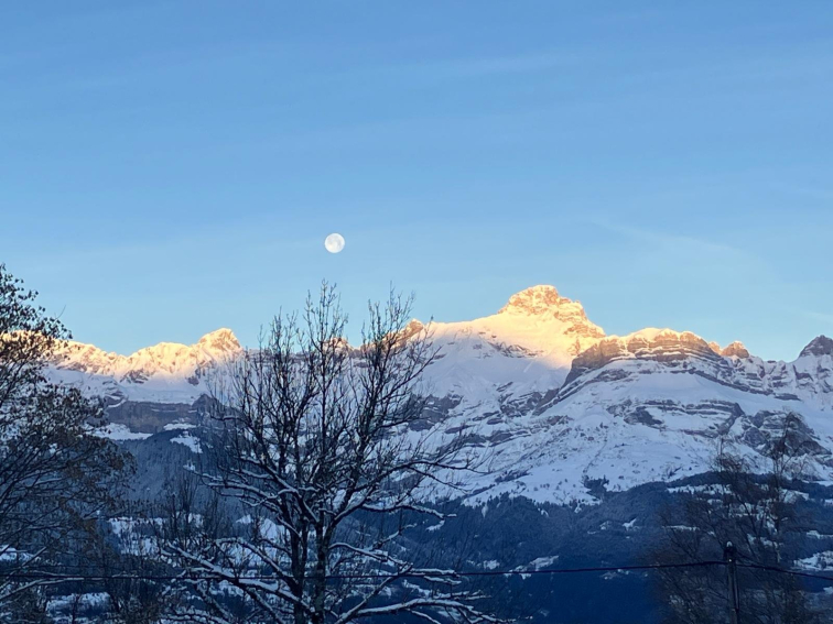 Le chalet fait face à la chaîne des Aravis et offre une vue panoramique grandiose.